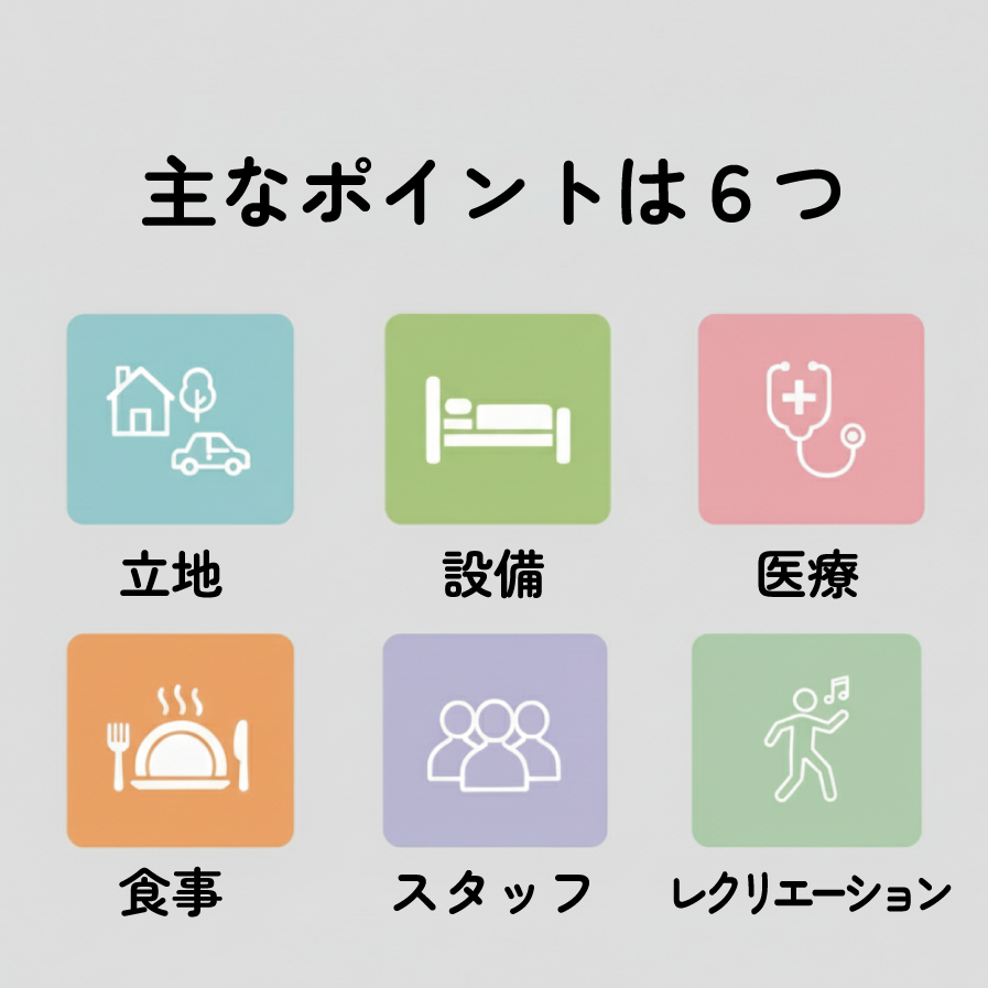 施設を選ぶ際のポイントは、「立地」「設備」「医療」「食事」「スタッフ」「レクリエーション」の6つです。施設による違いを踏まえて、この6つの項目を確認しましょう。