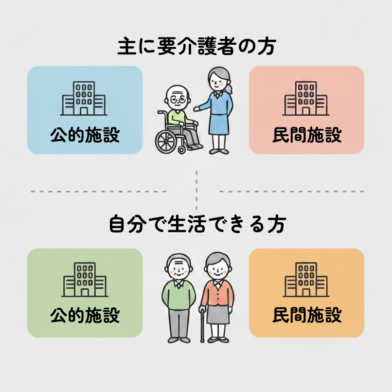 施設の違いを理解するポイントは「要介護者向け」か「自立している方向け」かです。さらに「公的施設」か「民間施設」かによって、サービスや費用が変わります。